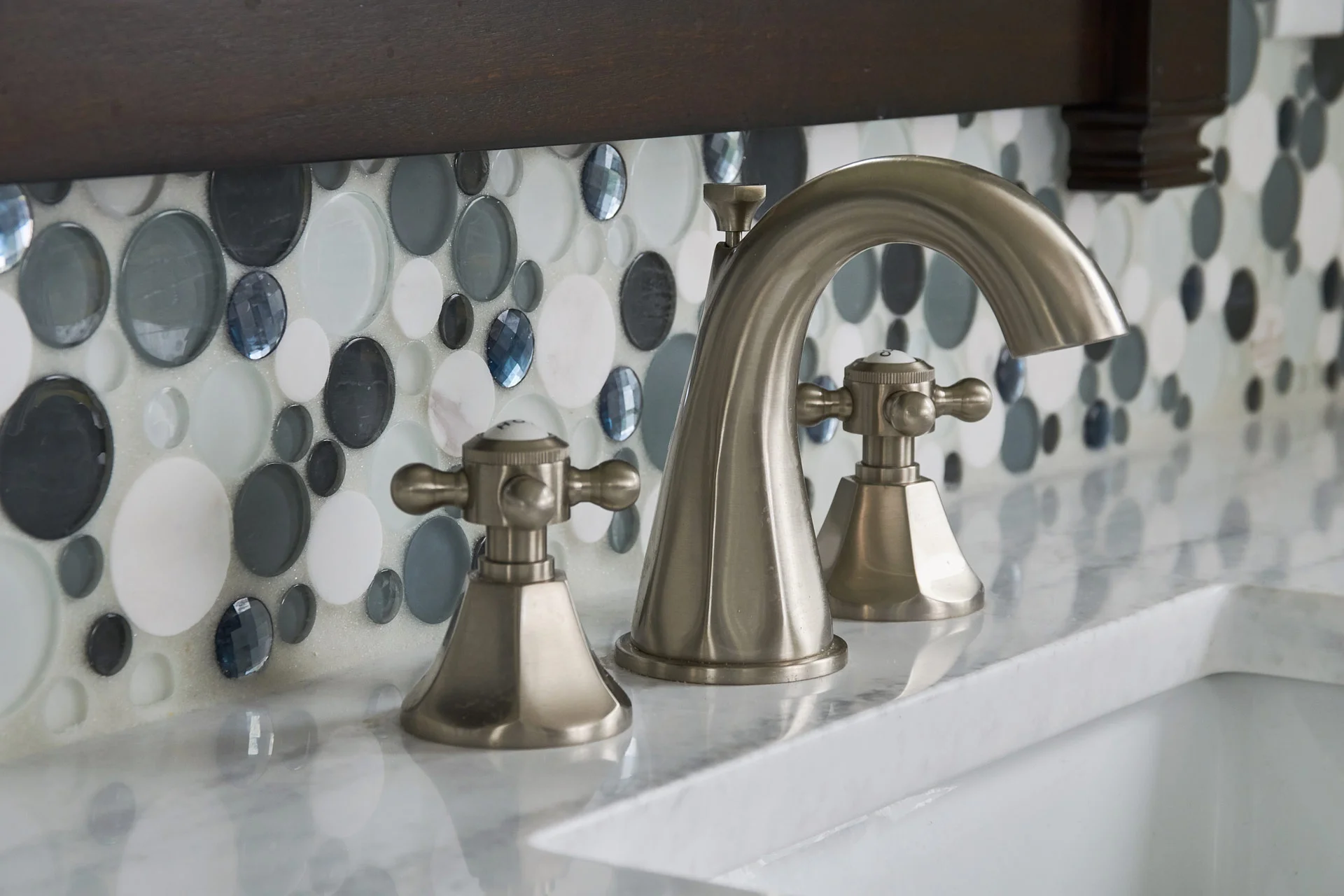 She was looking for something different with a touch of whimsy! We added dark, masculine, cabinetry for him and bubble tile for her.